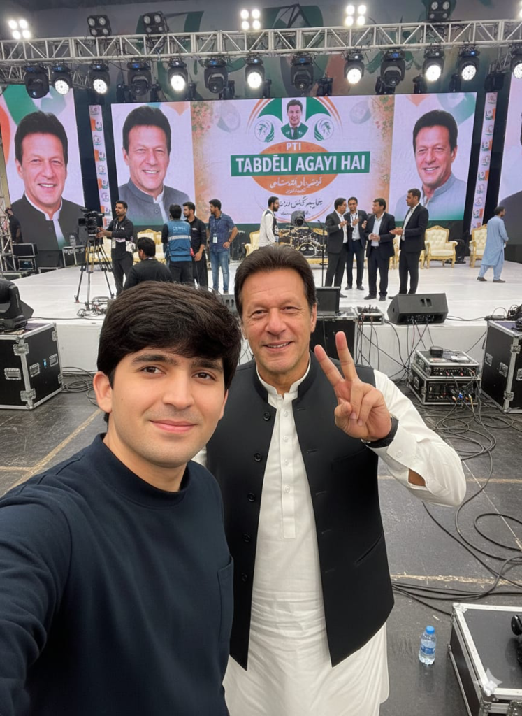 The attached person is taking a selfie with [ Imran Khan], standing at [ pti jalsa stage].